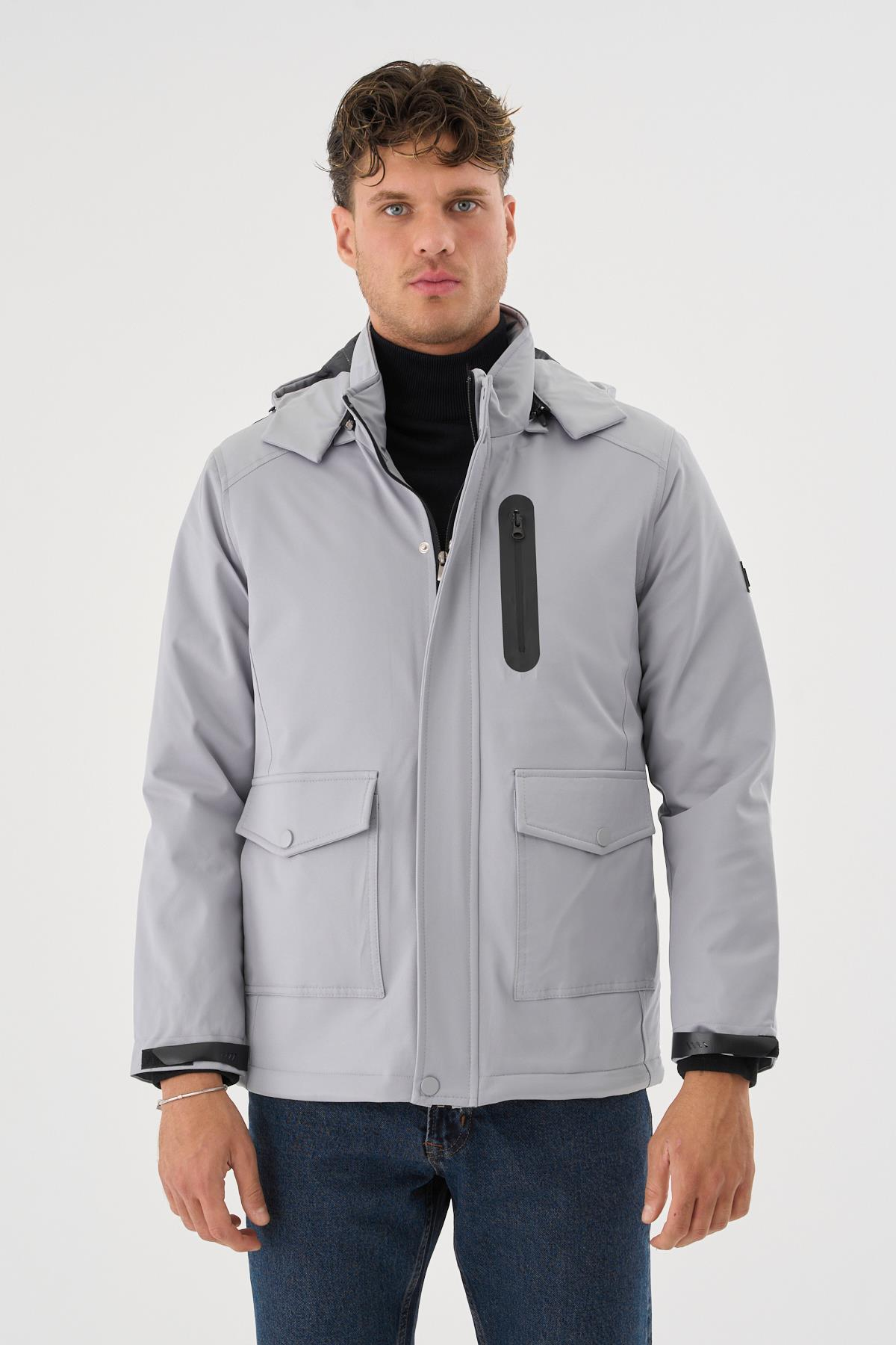 Erkek Gri Su Ve Rüzgar Geçirmez Çıkartılabilir Kapüşonlu Mont&Kaban