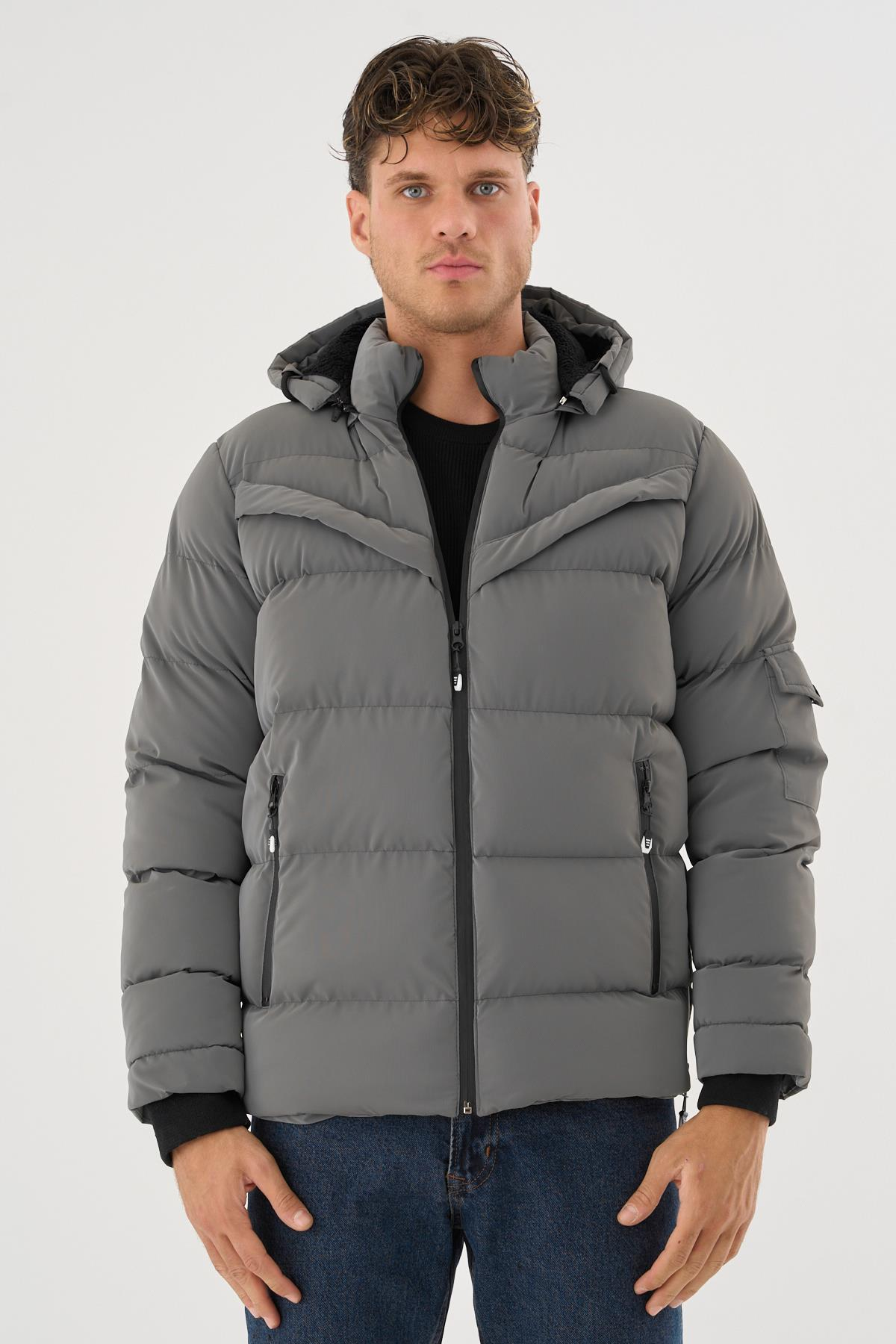 Erkek Gri Su Ve Rüzgar Geçirmez Kürklü Çıkartılabilir Kapüşonlu Mont&Kaban (KB3010)