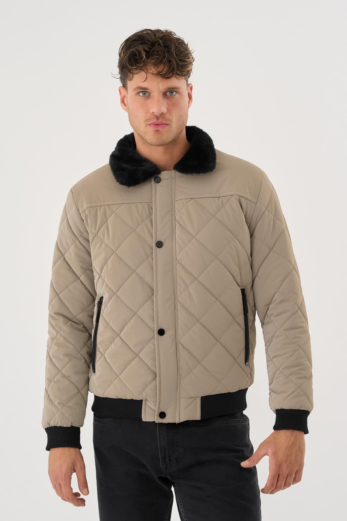 Erkek Krem Su Ve Rüzgar Geçirmez Yakası Ve İçi Kürklü Kapitone Mont (KB5421)