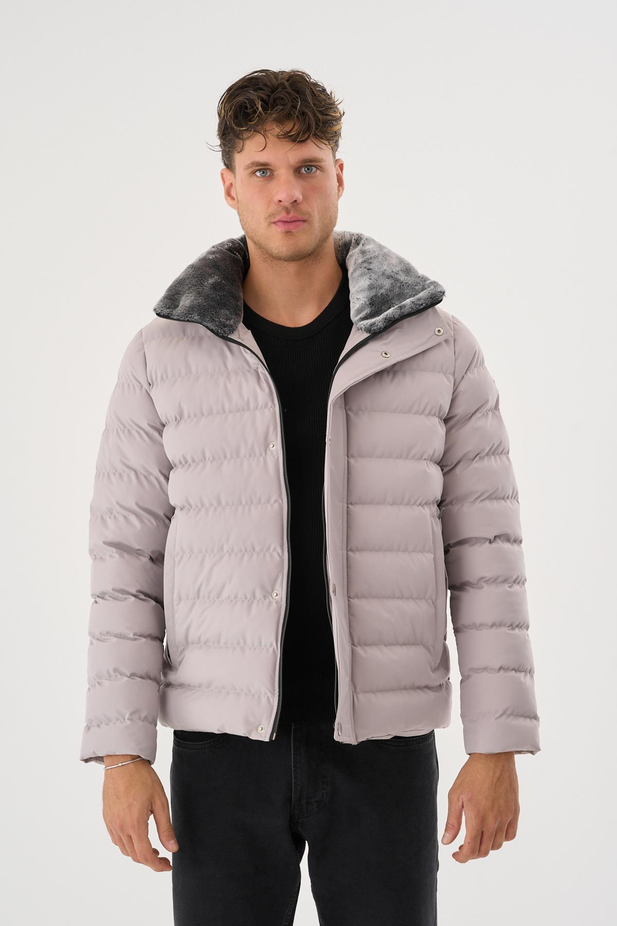 Erkek Krem Su Ve Rüzgar Geçirmez Yükseltilebilir Yaka Kürklü Mont&Kaban (YM4309)