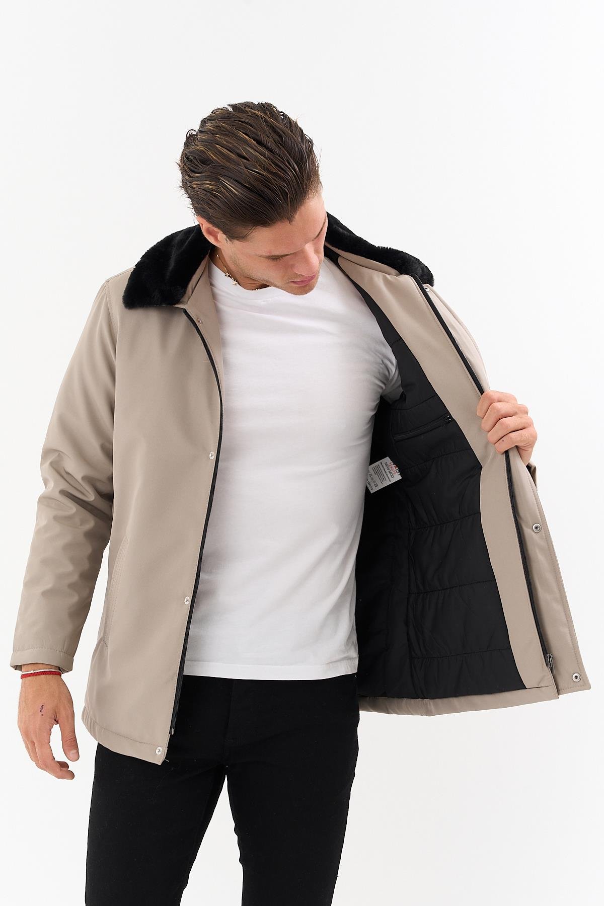Erkek Krem Yakası Çıkartılabilir Kürklü Su İtici İçi Kürklü Kaban – Rüzgar Geçirmez, Hafif ve Dayanıklı (SVM0290)
