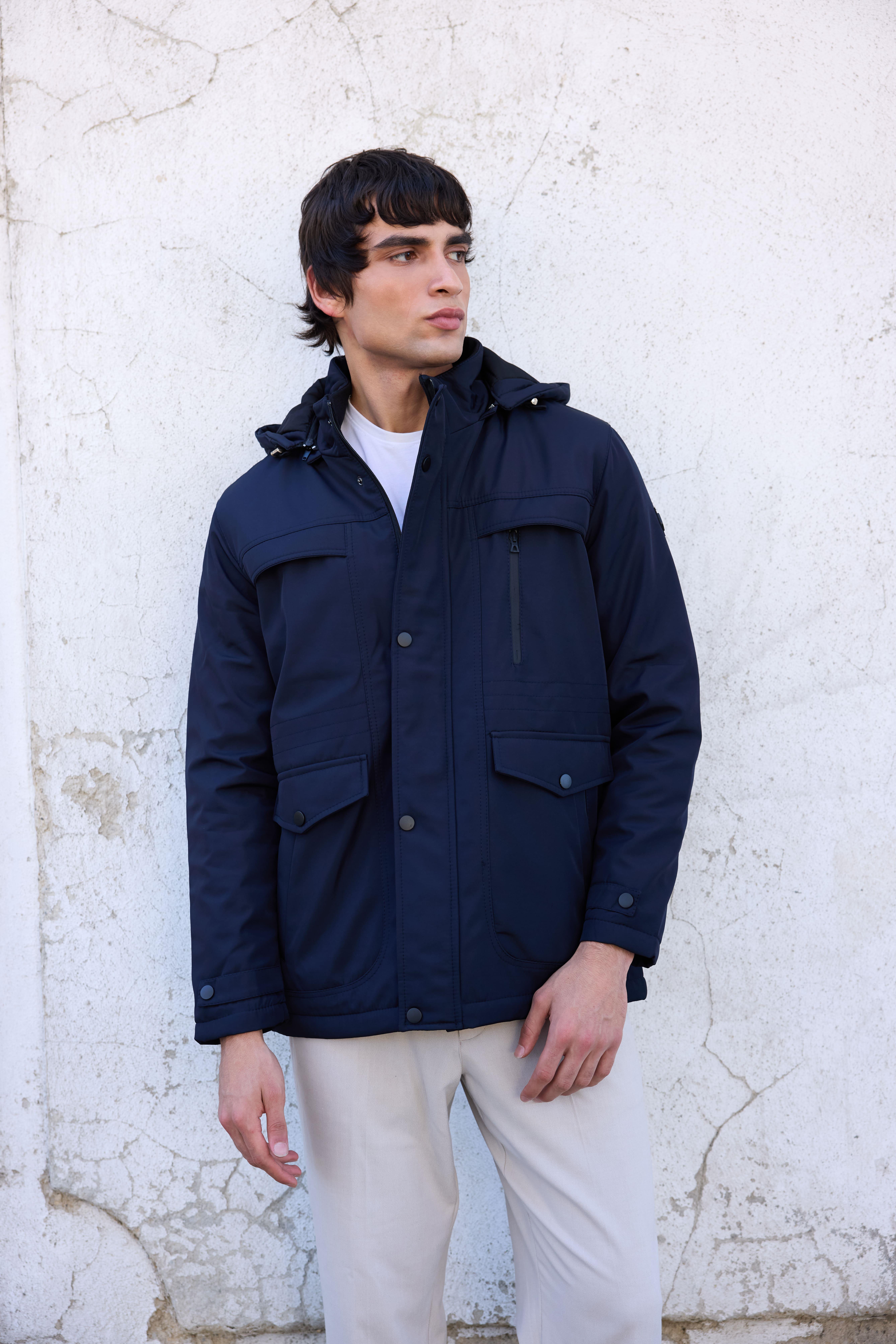 Erkek Lacivert Pamuk Polyester Karışımlı Kürklü Çıkartılabilir Kapüşonlu Mont&Kaban