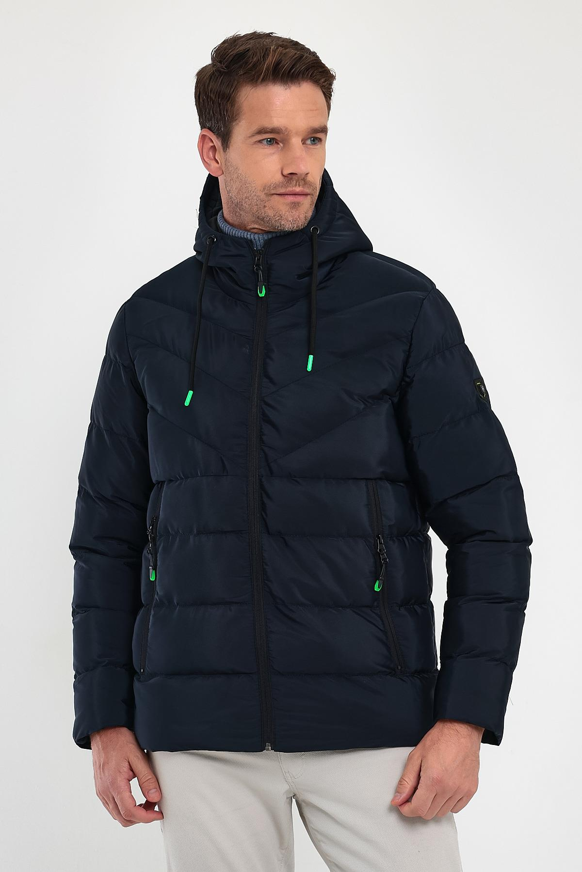 Erkek Lacivert Standart Fit Normal Kesim İçi Kürklü Sabit Kapüşon Dik Yaka Mont