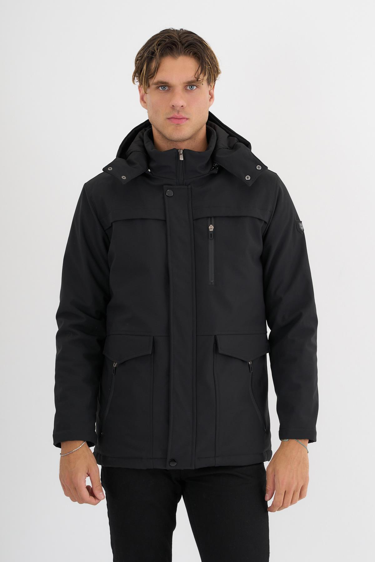 Erkek Siyah %100 Su Ve Rüzgar Geçirmez Kürklü Çıkartılabilir Kapüşonlu Mont&Kaban