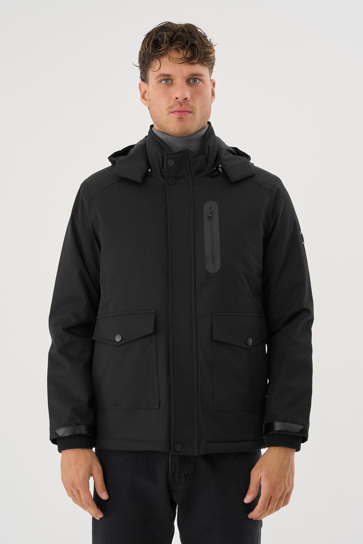 Erkek Siyah Su Ve Rüzgar Geçirmez Çıkartılabilir Kapüşonlu Mont&Kaban