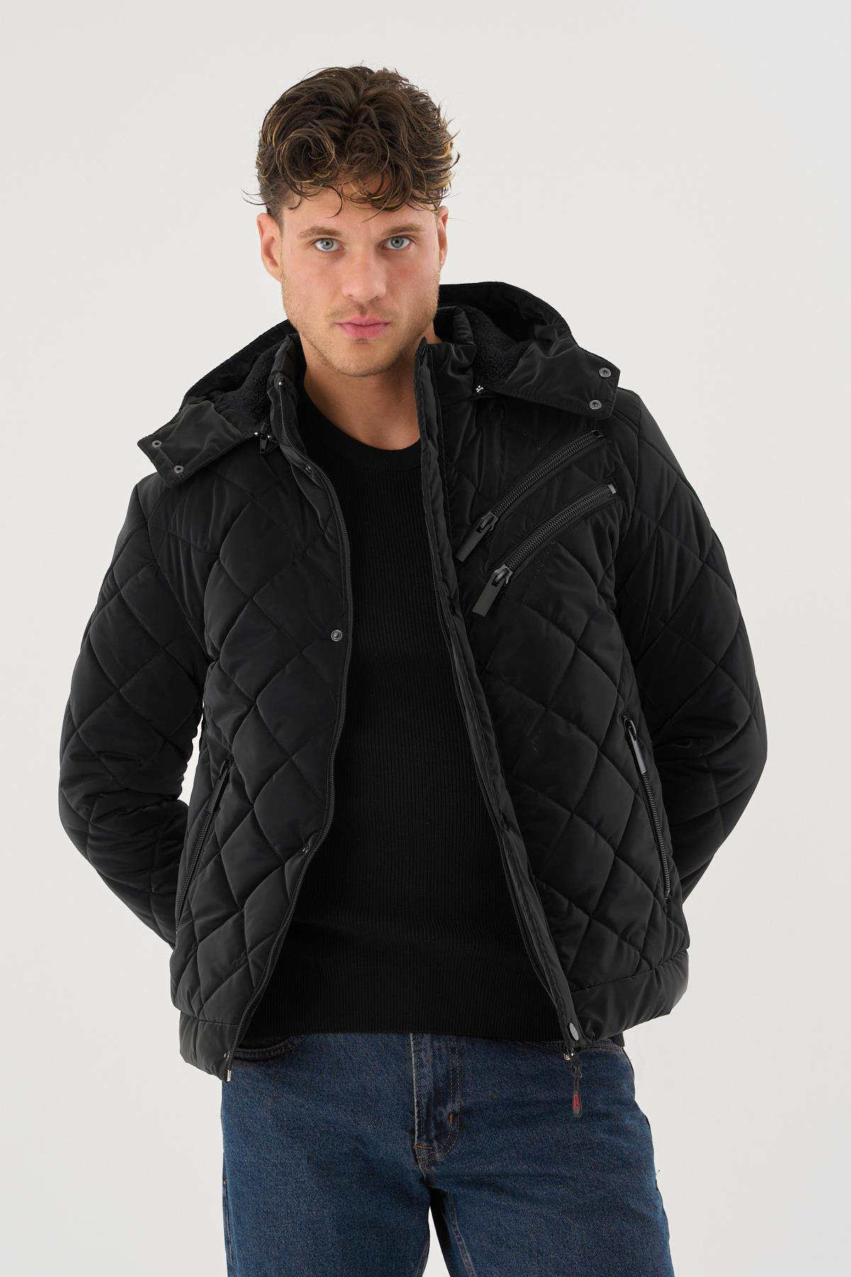 Erkek Siyah Su Ve Rüzgar Geçirmez İçi Kürklü Çıkartılabilir Kapüşonlu Kapitone Mont&Kaban (KB6544)