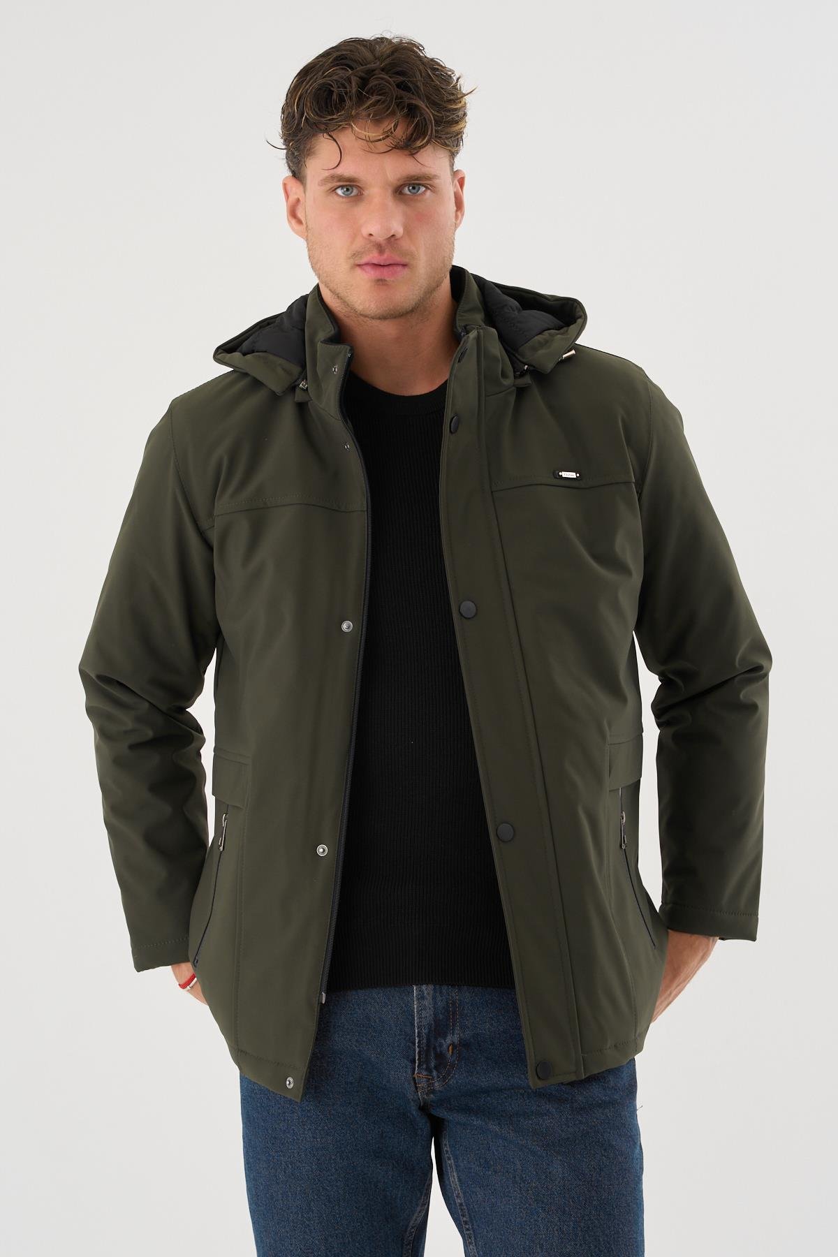 Erkek Yeşil %100 Su Ve Rüzgar Geçirmez Kürklü Çıkartılabilir Kapüşonlu Mont&Kaban
